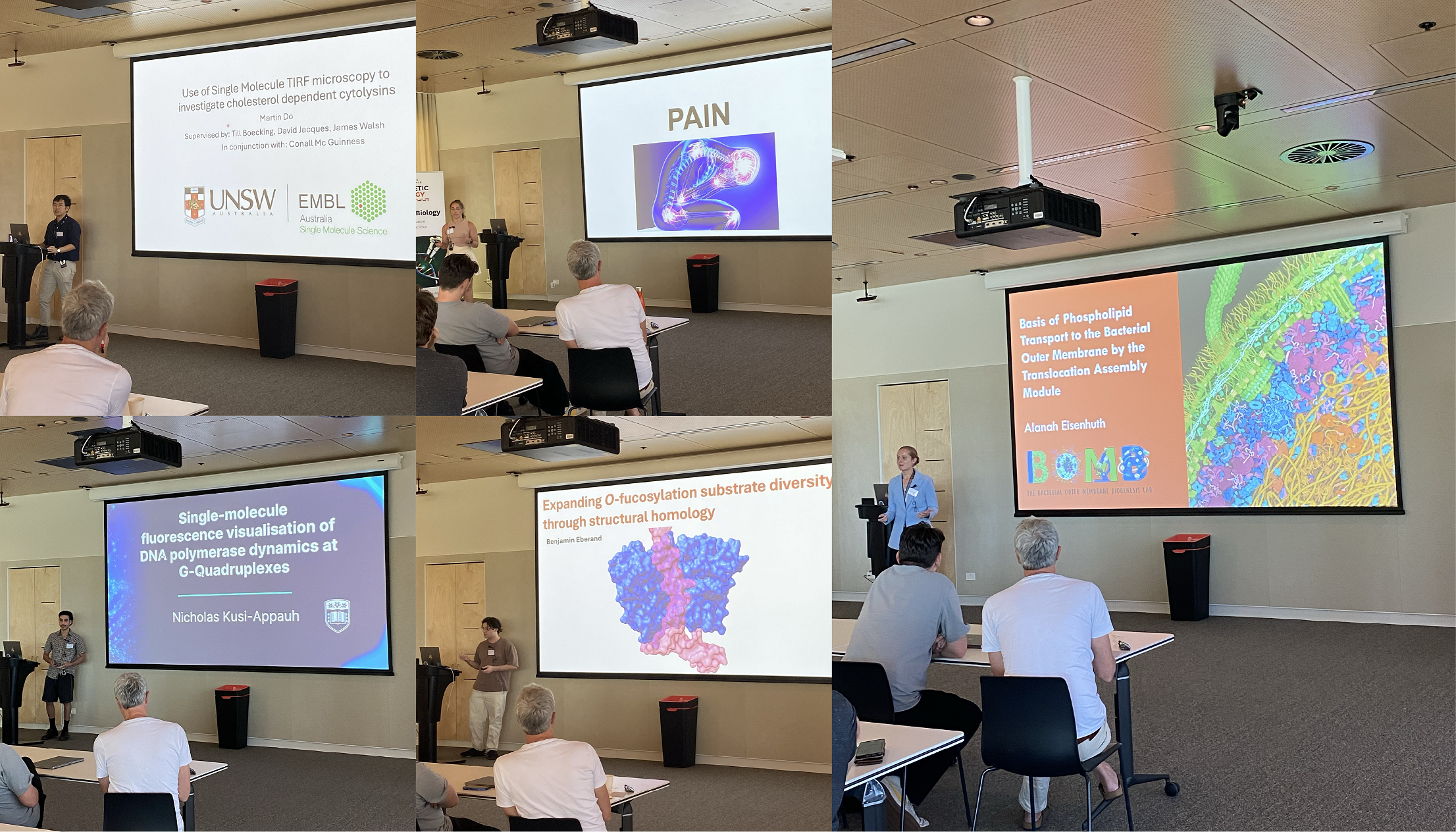 Jessica Buchanan (USyd) kicked off proceedings with her development of novel cyclic peptide binders for RIPK3. Next, Gesa Gruening (UNSW) took us through her work on the role of intra-protein motion in magnetoreception and light harvesting systems. Then Nicholas Marzano (UoW) presented his work on developing single molecule methods for studying the chaperone activities of Hsp70/90. Finally, Qiang Zhu (UoW) showed his work using molecular dynamics to study the mechanisms of Lin28 binding to microRNAs.